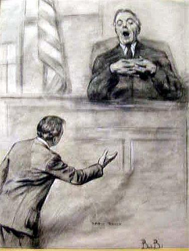 FOUR CHARCOAL DRAWINGS OF COURTROOM SCENES; "Motion Denied", "Red Tape", "Motion Granted", "The Quality of Mercy is Not Strained", signed Barbara Barb apx. 23"h x 17"w, losses