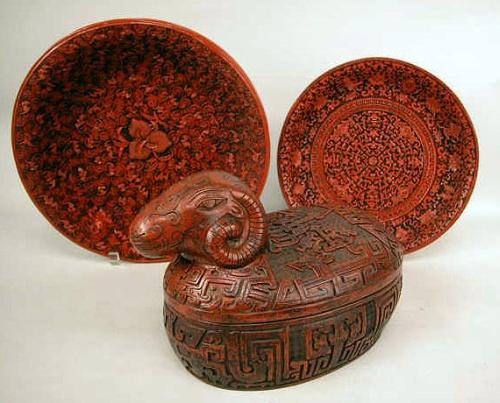 FOUR CINNABAR-COLORED PLATES; three, 11"dia., and the fourth, 14"dia.