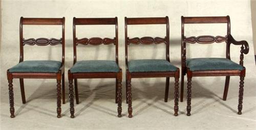 CHAIRS: four circa 1890 Regency style chairs, three side and one armchair, each with carved back splat, turned and pineapple carved front legs.