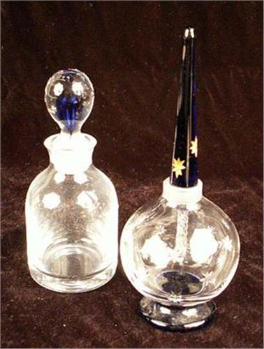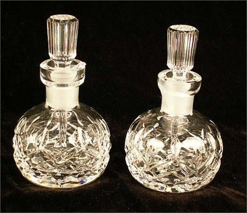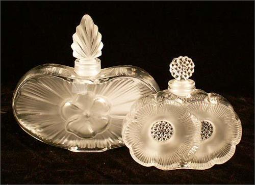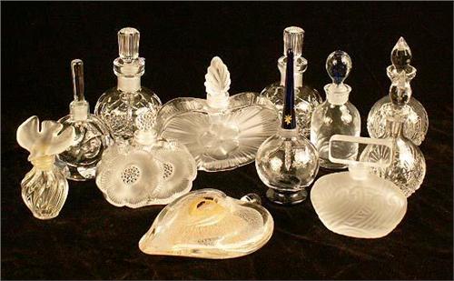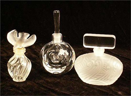 Three signed Lalique, tallest 4 3/4"h. Together with a large group of colorless scent bottles, including Waterford and Wedgwood