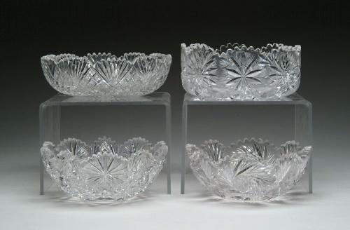 FOUR CUT GLASS BOWLS. 1) Cut in hobstar pattern. SIZE: Approx. 8 in. dia. 2) Cut in pinwheel pattern. SIZE: Approx. 8 in. dia. 3) Cut in snowflake pattern. SIZE: Approx. 8 in. dia. 4) Strawberry diamond and fan low bowl with star cut base. SIZE: 9 in. dia x 3 in. t. CONDITION: Minor edge roughness, otherwise very good to excellent. Estate of Edwin Schiebel Sr. 5-60221, 5-60225