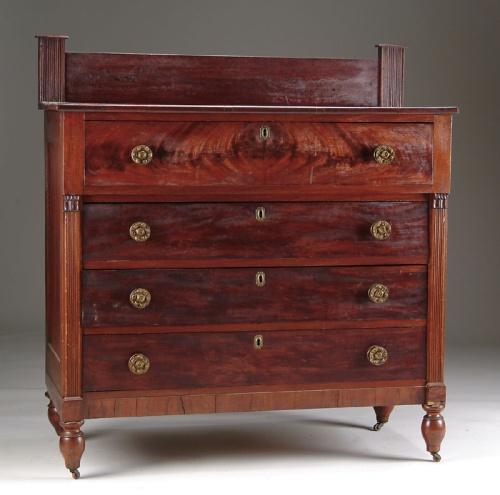 FOUR DRAWER MAHOGANY FEDERAL CHEST. Each drawer fitted with original large brass rosette pull, flat reeded side columns with carved capitol. Backsplash with similar reeded columns and straight splash. Nice mahogany veneers. All resting on short turned legs with wheels. Paneled sides. SIZE: 48in. h x case 43-1/4in. x 19-3/4in.. CONDITION: One small piece of bottom area above reeded column missing. Generally very good. 9-26124