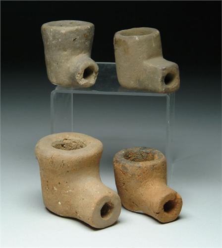 FOUR ELBOW PIPES. Sandstone and ceramic. Near Dresden, Lee County, VA. Mississippian to Proto-Historic, Circa 1200-1600AD style. SIZES: Largest is 3in. x 2-1/2in.; Smallest is 2in. x 2-1/2in.. CONDITION: Generally very good. 9-25984-94, 9-25984-52 The Tennessee Collection of Prehistoric Indian Artifacts from the Allen Graves Estate. SPECIAL NOTE: We do not regularly sell Prehistoric Indian stone artifacts and therefore have very little experience and no expertise in this area. All of the following lots have come from the Collection of the Late Allen Graves of Tennessee. The collection was inherited some years back by his daughter, who now lives in Maine. This collection was consigned to us directly from her. We employed someone to generally identify styles and types, but as stated above, due to our lack of expertise in this field, we can not guarantee the age or origin of the following pieces. We are relying on you, the buyer, to determine to your satisfaction the origin and age of each item in the collection.