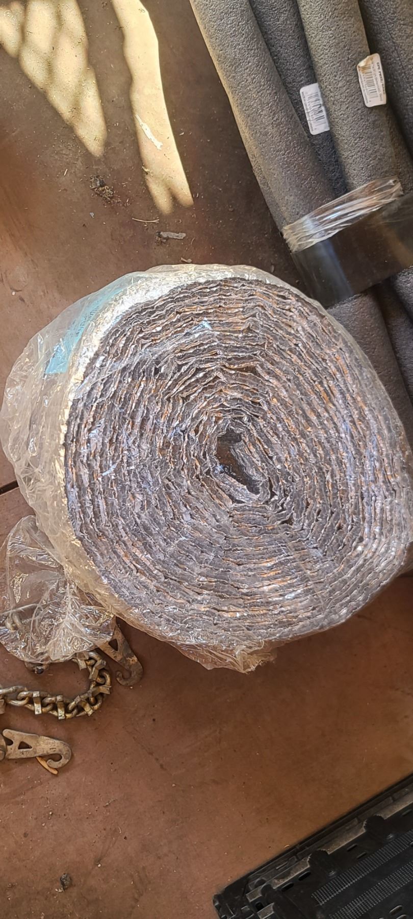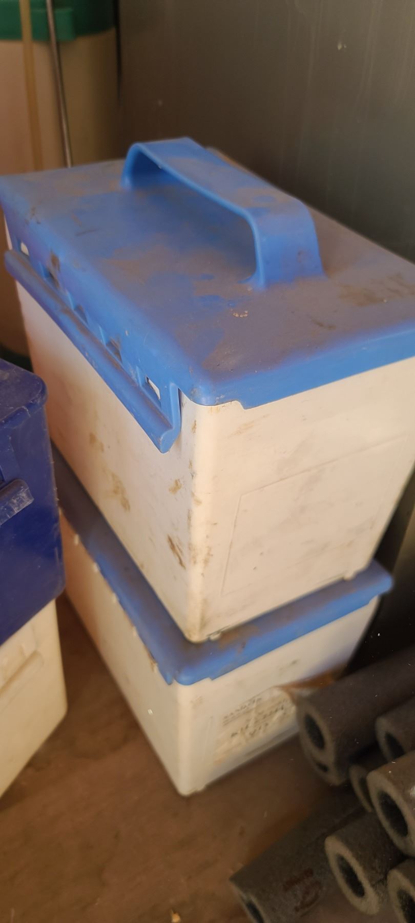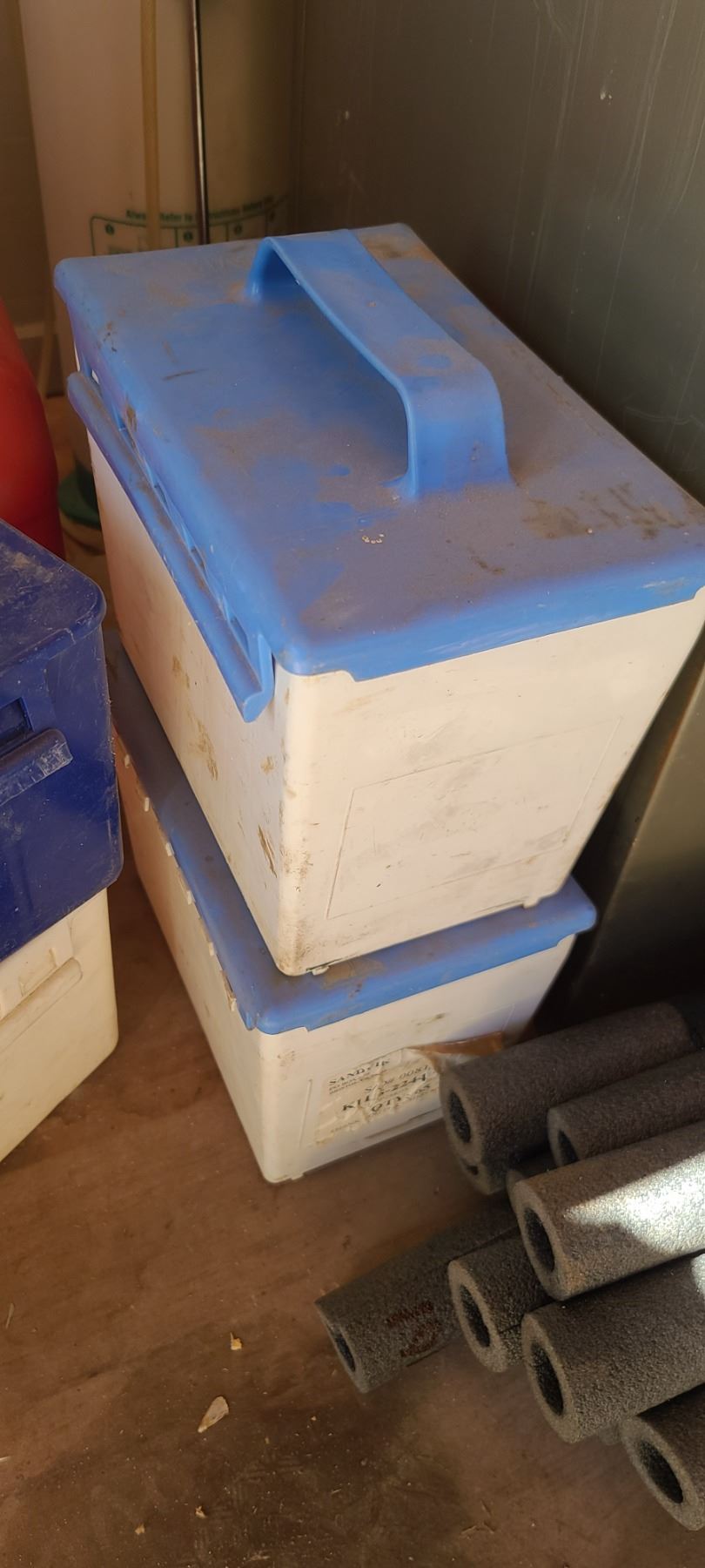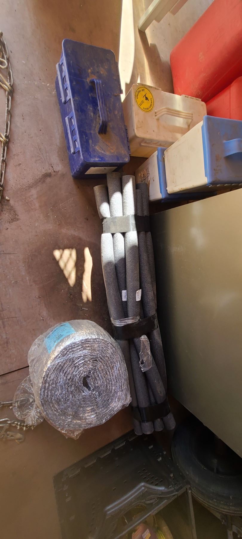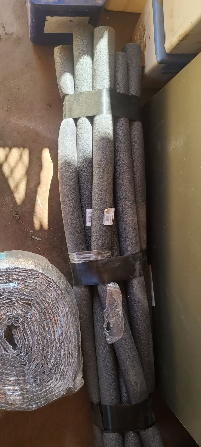 FOUR EMPTY PLASTIC CONTAINERS AND BUNDLE OF PIPE INSULATION