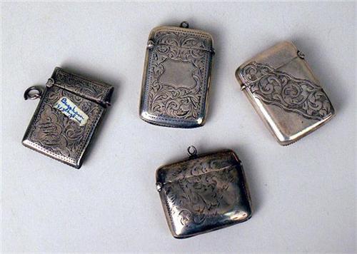 All hallmarked Birmingham, one dated 1902, one dated 1913, and two dated 1924, all with engraved decoration. Largest 2 1/8"h x 1 3/8"w.