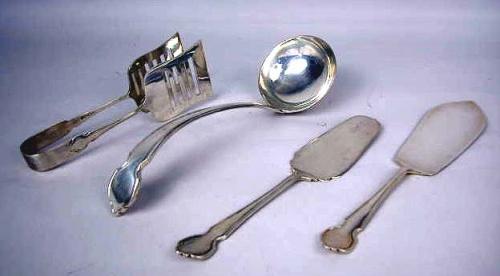 FOUR ENGLISH STERLING SILVER SERVING PIECES; Hallmarked E.V., Sheffield, 1931, comprising: a soup ladle, 11" long, a pastry tongs, and two flat servers, weight apx. 24 T.O.