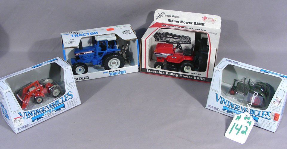 1 Ford 8N die cast, 1 Massey-Harris Challenger and 1 Ford TW-5 FWDA tractor and 1 misc. True Value riding lawn mower bank by Lawn Cheifs.