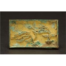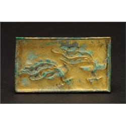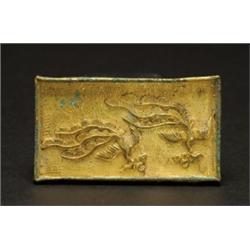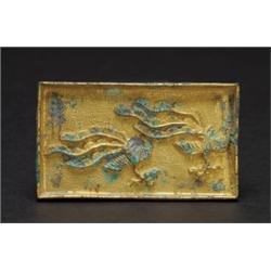 FOUR GILDED BRONZE BELT PLAQUES, each oblong plaque with shallow vertical rim showing a pair of phoenixes in low relief on a punchwork ground; with backing plates and fastening pins to the back corners, 1.5 x 2.7" - 3.8 x 6.9 cm., China, Tang Dynasty, 618-907 A.D.