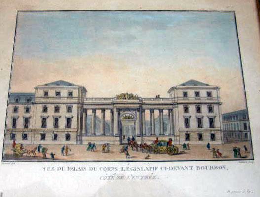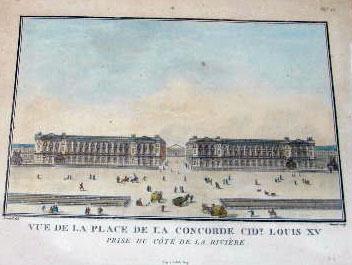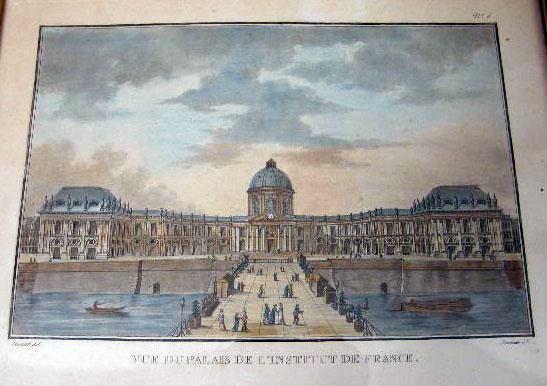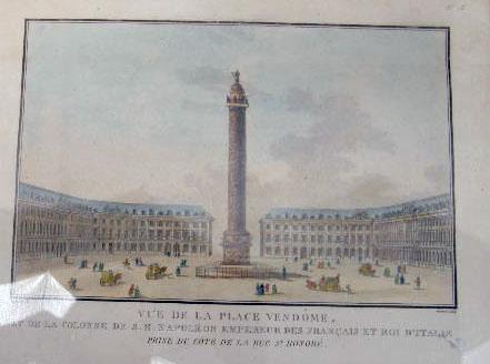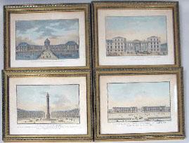 (Jean-François Janinet, French, 1752-1814). From his circa 1807 series, "Vues des plus beaux edifices publics et particuliers de la ville de Paris", and comprising "Vue de la Place de le Concorde Cit`d Louis XV", "Vue du Palais Corps Legislatif Ci-Devant Bourbon", "Vue du Palais de l`Institut de France" and "Vue de la Place Vendome", each notated l.l.c. "Durand imp", l.r.c. "Janinet sculp". Janinet is considered one the most accomplished French engravers of the 18th century, whose images stand as a testimony to the superior quality of early French color printing. In 1771 he began to work in Bonnet`s atelier where he soon mastered the techniques of multiple-plate color printing, refining those processes by 1772 to produce the first color prints in imitation of watercolor and wash drawings, executed entirely with specialized engravers tools and without recourse to aquatint. Sight size the first 7 5/8"h x 12 1/4"w, the second 5 3/8"h x 8 1/8"w, the third 3 3/4"h x 5 5/8"w