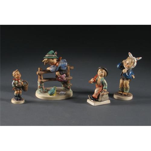 PORCELAIN: A lot of four Hummel porcelain figurines. The first is entitled, ''Retreat to Safety'' (on sitcker) and depicts a boy climbing over a fence, both hands on rear side of fence, signed ''MJ Hummel'' in script on rear of base, hallmarked blue bee in V '' W Goebel, West Germany'', some paint loss to flower in hat, 6'' x 4 1/2'' x 3 1/2''. The second represents a young boy walking with an umbrella, no title (sticker off), script signature on base, blue bee in V, ''W. Germany'', tiny fleabite to base, 4 1/2''. The third depicts a boy with a kerchief around his head, title sticker off, script signature on base, hallmarked with under glazed numbers, 217-1951, 5 1/2'', slight crazing noted to base. The fourth is entitled, ''Village Boy'' (sticker present), script signature on base, hallmarked, incised numbers under glaze, 4'', 513/0, no damage noted.