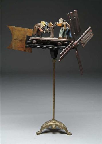 FOUR MAN RAILROAD HAND CART WHIRLIGIG. From the Gandy Dancer Soo Line yard in Green Bay, Wisconsin. Whirligig shows a rectangular cart set on black railroad tracks. Two painted wood jointed figures on each side pump the cart as the wind turns the front blade. A painted orange fin in the back and a slatted painted red front propeller. SIZE: 32” l x 22” h. CONDITION: Weathered surface, good. 9-27531