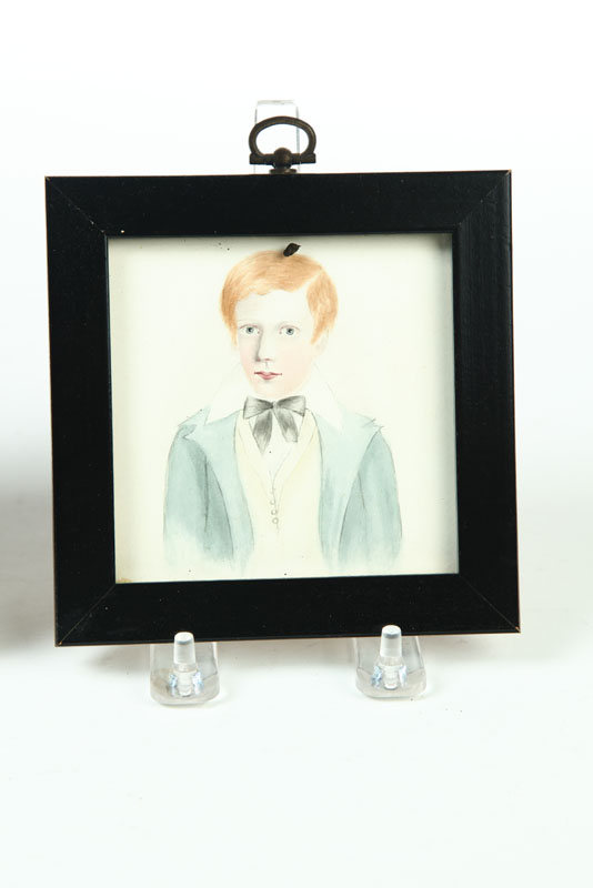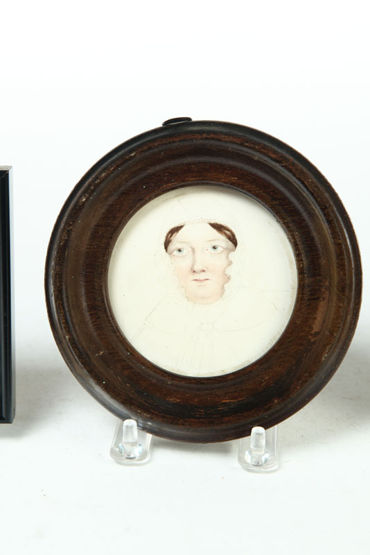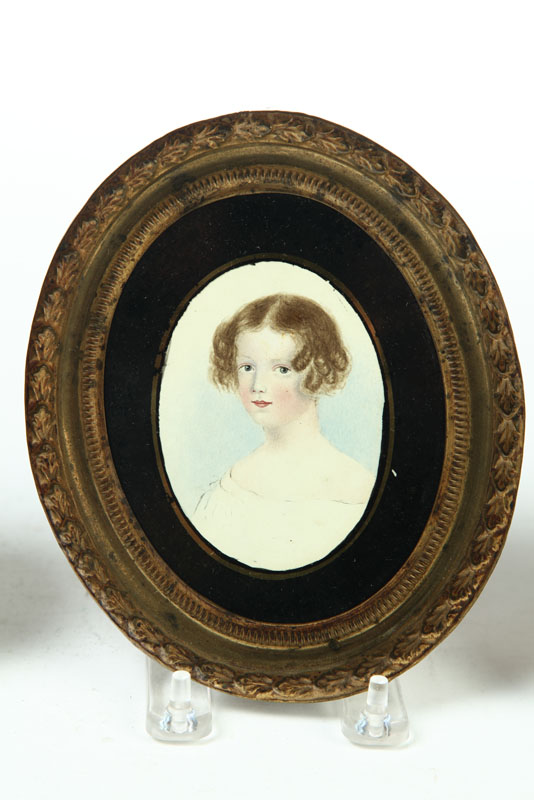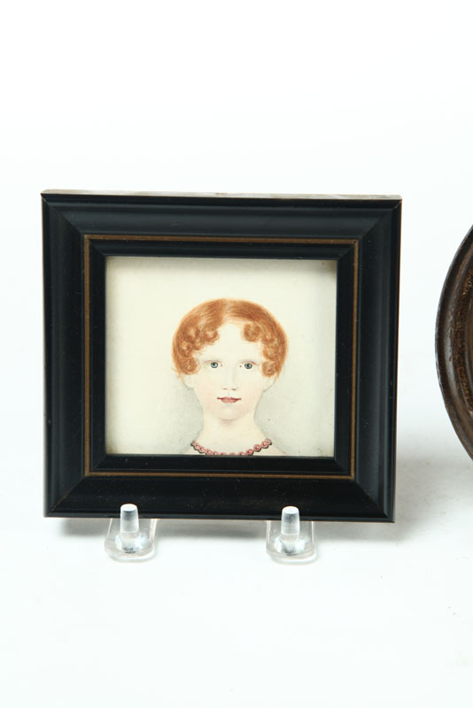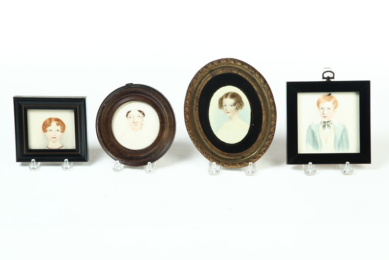 American, ca.1840, watercolor on heavy stock. Identified as Mrs. Irvine, the family matriarch and three grandchildren, Maggie, Elize and George. The latter two have partial Whatman watermarks in the stock. In frames, 5"d., 7"h., 4"h. 4 1/4"w. and 5" x 5" respectively.