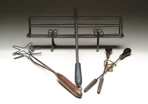 FOUR MISCELLANEOUS HOUSEHOLD ITEMS. 1) 18in. l x 15-1/2in. w swing handle wrought iron toaster. 2) 16in. l two wood handled toddy irons. 3) 18-1/2in. star shaped hand held toaster. CONDITION: Very good. 9-26204