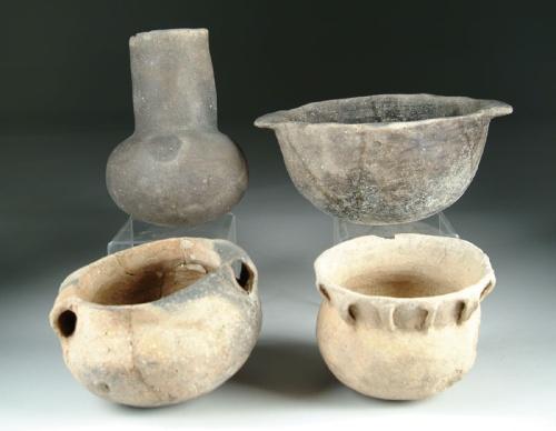 FOUR MISSISSIPPIAN TYPE POTS. Mississippian period, Circa 1200-1500AD style. 1) Water bottle with damaged rim but otherwise sound. 7-1/4in. h x 5in. w. 2) Pot with neck appliques and pseudo strap handles. Shows some exfoliation on the body of the pot. Generally fair. 4-1/4in. h x 5-1/4in. dia. 3) Strap handled pot showing numerous cracks and repairs with some exfoliation on the surface. 4-1/2in. h x 6in. dia. 4) Bowl with lug handles shows stress fractures and repair but generally fair to good. 9in. dia x 4-1/2in. h. CONDITION: As noted above. 9-25984-56 The Tennessee Collection of Prehistoric Indian Artifacts from the Allen Graves Estate. SPECIAL NOTE: We do not regularly sell Prehistoric Indian stone artifacts and therefore have very little experience and no expertise in this area. All of the following lots have come from the Collection of the Late Allen Graves of Tennessee. The collection was inherited some years back by his daughter, who now lives in Maine. This collection was consigned to us directly from her. We employed someone to generally identify styles and types, but as stated above, due to our lack of expertise in this field, we can not guarantee the age or origin of the following pieces. We are relying on you, the buyer, to determine to your satisfaction the origin and age of each item in the collection.