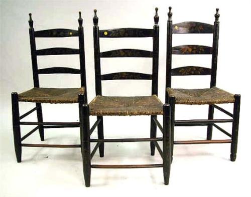 FOUR NEARLY IDENTICAL BLACK-PAINTED AND STENCIL-DECORATED TURNED MAPLE LADDER BACK RUSH SEAT SIDE CHAIRS; Probably New Jersey, some wear and repairs, paint of a later date