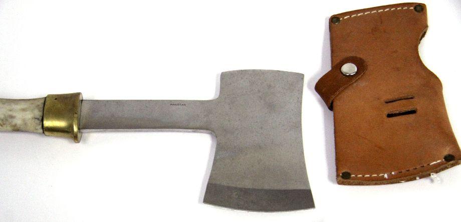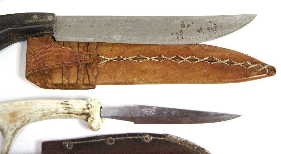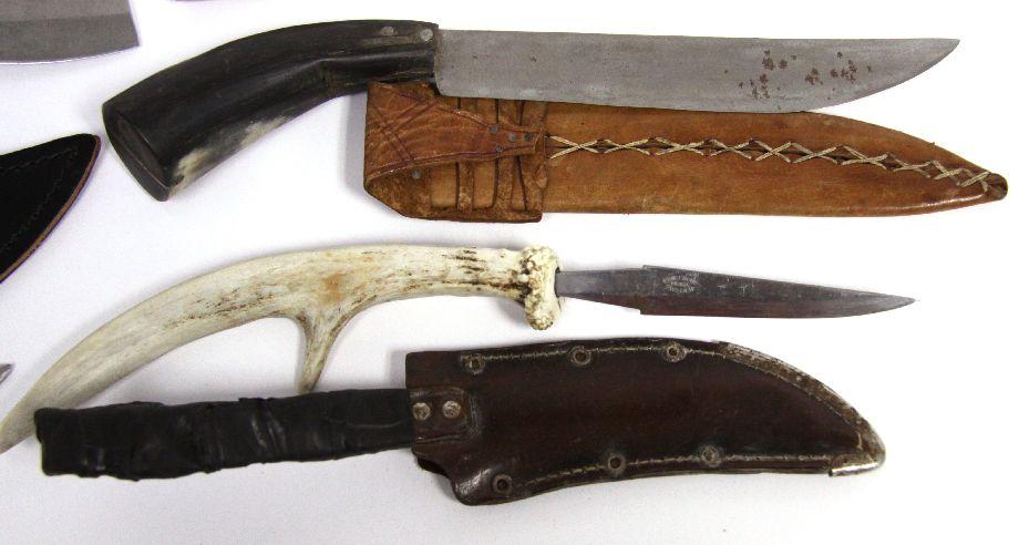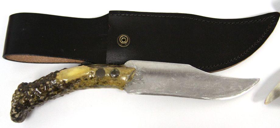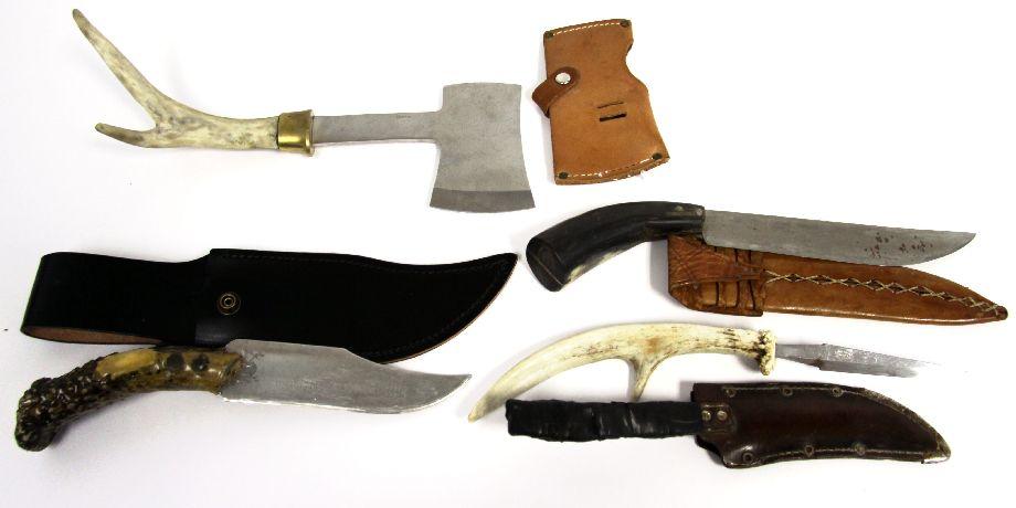 Four novelty blades with antler handles. Knife with 3 inch blade, marked "Erik Frost / Sweden", and leather scabbard; antler handled hatchet like blade, made in Pakistan; Crude hand made 7 inch blade, with horn handle; hand made and engraved clip point blade, engraved "This knife custom made for S. Rogers", and "God grant me responsibility", with antler handle. All in good condition, with leather scabbards.