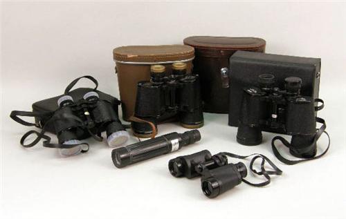 Comprising a Bushnell 8x30 in a Nikon case, a Selsis 10x50 in a leather case, a Yahica 8x40 and a Tasco 10x50. Together with a German Leeadler 10-30x30 zoom spotting telescope. 5 pieces.