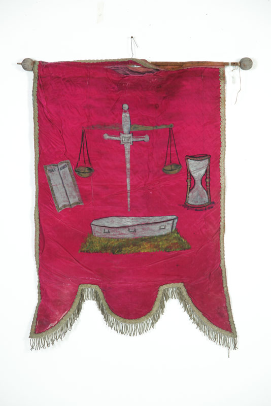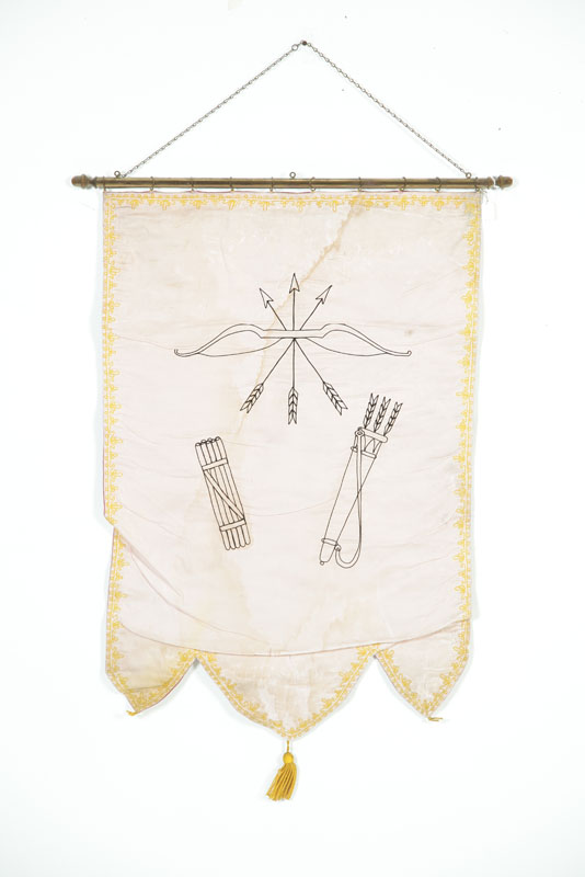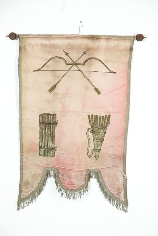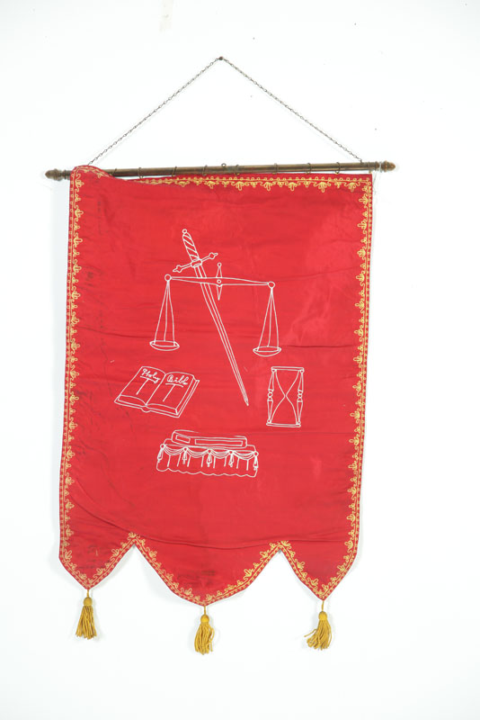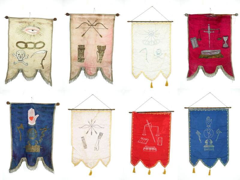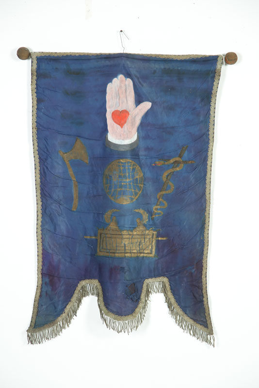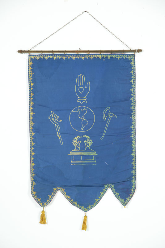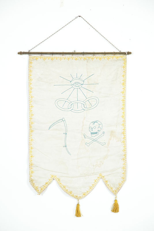 Possibly Ohio, early 20th century, silk. Each pair has a hand painted banner with Odd Fellows symbology and a matching embroidered banner. Imperfections. 27"h. 20"w. and 31"h. 22"w.
