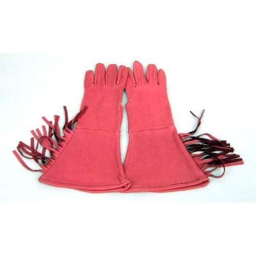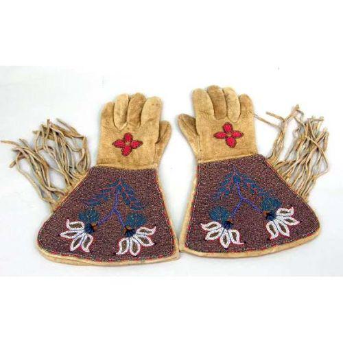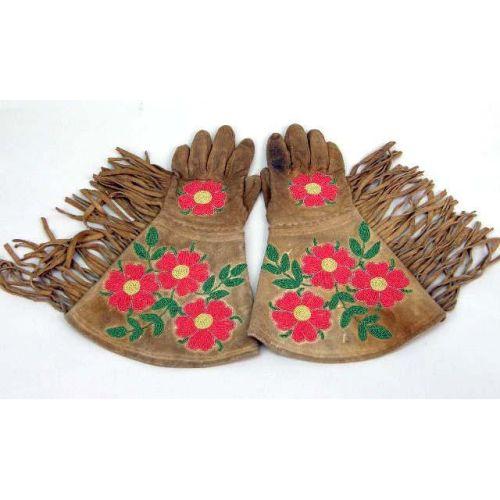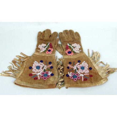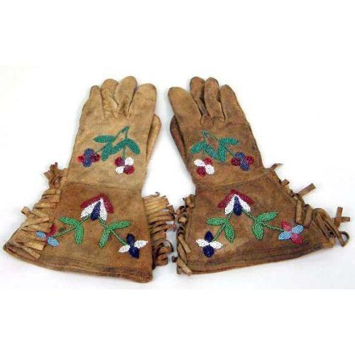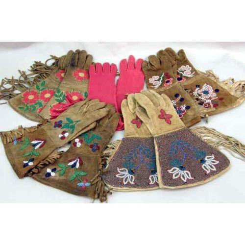 FOUR PAIRS OF INDIAN-BEADED DEERSKIN FRINGED GLOVES<BR><BR>Together with a modern red deerskin pair, slight soiling, wear to hide, all approximately 14"l. 10 pieces