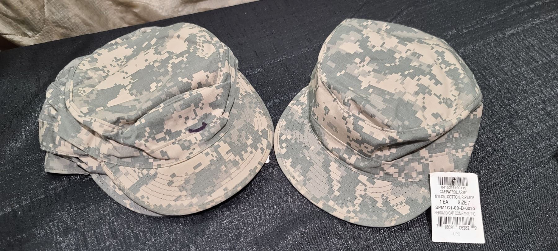 FOUR PATROL CAPS IN DIGITAL ARMY COMBAT CAMOUFLAGE. 6 7/8", 7", 7 1/4", 7 7/8"