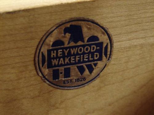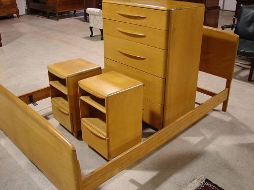 FOUR PIECE HEYWOOD WAKEFIELD BEDROOM SUITE. Wheat color. Consists of double bed (35.5” H, 53.5” W), five drawer tall chest with graduated drawers (46” H, 33.5” W), pair of matching single drawer nightstands with shelves (25” H, 15” W, 14.5” D). One nightstand shows water staining at top.