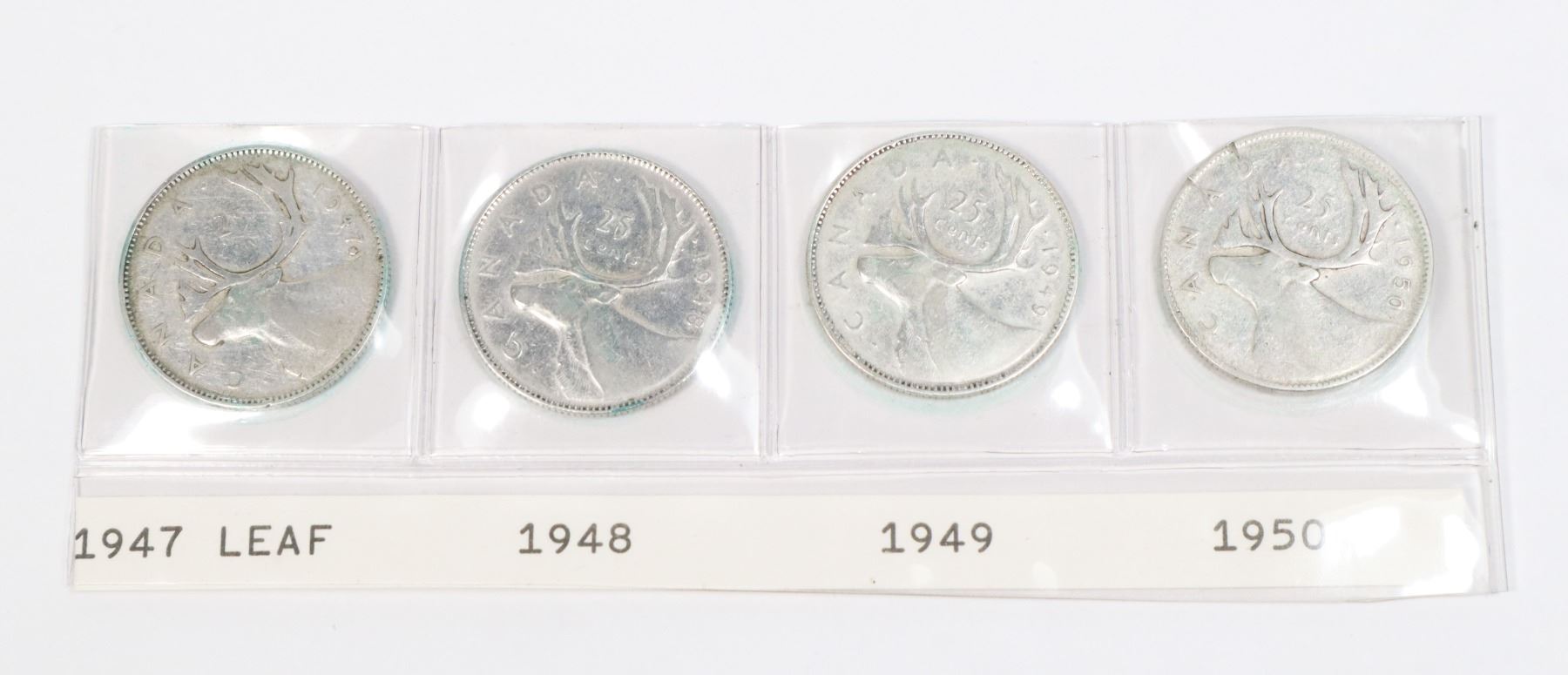 FOUR PIECE SILVER CANADIAN 25 CENT COINS 1947,