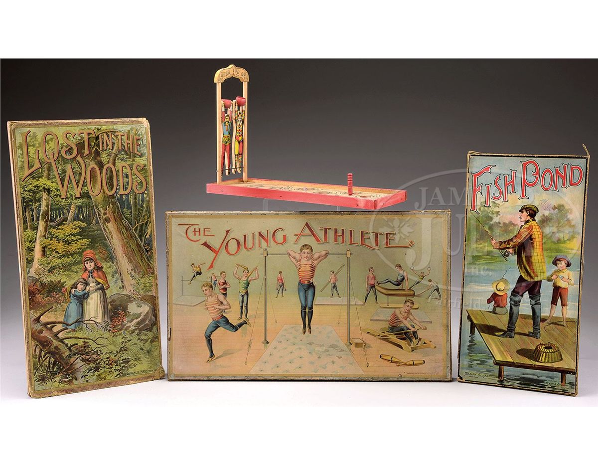 One of the better paper lots including 1) "Lost In The Woods" board game by McLoughlin Bros. Spectacular imagery on large boxed set, includes interior board and game pieces. 2) A Crandall "Here You Go" paper on wood marble target game. Includes original swirled marbles and trapeze figures of clown and circus performer. 3) Oversize game of "The Young Athlete" Copyright 1898 Chaffee & Selchow, New York. Best of Victorian box graphics showing boys playing in nine different gym activities. Interior board game and pieces. 4) The "Fish Pond" game by Clark & Sowdon N.Y. Interior shows boys fishing with four different included rods, hooks, and paper litho fish. SIZE: Largest 23" l. PROVENANCE: The Diane and late Steve Olin collection. CONDITION: Lot averages very good to near excellent. 13271-11