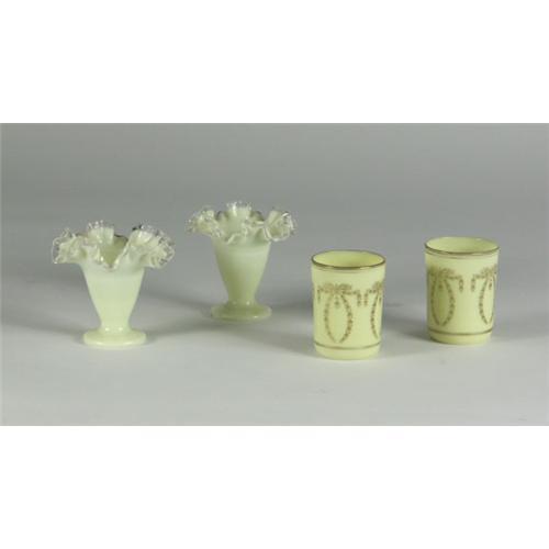 Four pieces of custard glass to include a pair of ruffle rim candle holders, 4'', and a pair of small tumblers with gilt floral and swag detailing, 3.5'', some wear to gilding, no chips or cracks noted.