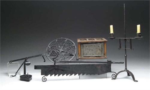 FOUR PIECES OF WROUGHT IRON AND FOOT WARMER. Lot includes 1) 22-3/4” h x 13” w wrought iron double adjustable table top candle stand. 2) 6” h hanging wrought iron grease lamp with bird finial and hanging hook. 3) Large 28” saw tooth fancy wrought iron trammel. 4) 10-1/2” dia x 23” l rotating wrought iron broiler. 5) 6” h x 9” w x 8” d wood and tin pierce decorated foot warmer. CONDITION: Very good. 9-27933