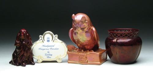 FOUR PIECES OF ZSOLNAY POTTERY. Lot consists of four nice pieces of contemporary Zsolnay pottery. 1) Owl on a book with feather in talon with contemporary "1868" mark and artist signed "Orye". SIZE: 6-1/2 in. t. CONDITION: Very good to excellent. 2) Figurine of seated Spaniel in unusual mahogany glaze with contemporary "1868" mark and artist signed "Orye". SIZE: 4-3/4 in. t. CONDITION: Very good to excellent. 3) Cache pot with decorative openwork rim and mottled mahogany glaze with contemporary "1868" mark. Small scratch to glaze just under the mark, may indicate experimental piece. SIZE: 4-1/4 in. t. CONDITION: Very good to excellent. 4) Small display sign in white porcelain with gold trim and blue lettering "Handpainted Hungarian Porcelain by Zsolnay Pecs". SIZE: 5 in. w x 4-1/2 in. t. CONDITION: Very good to excellent. 5-60604, 5-60605, 5-60607, 5-60608