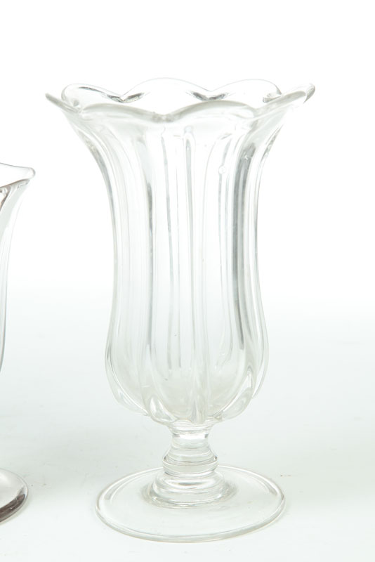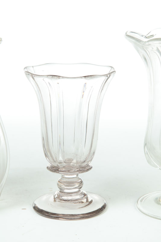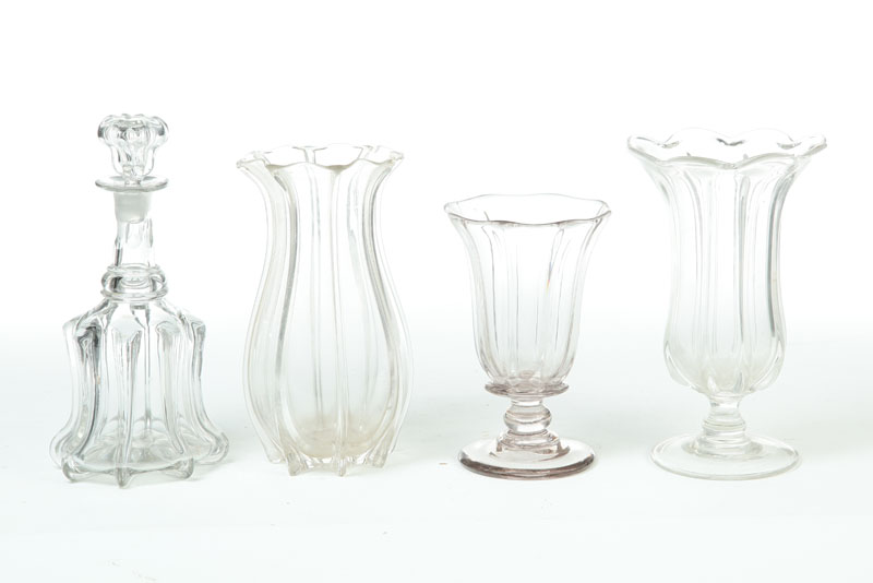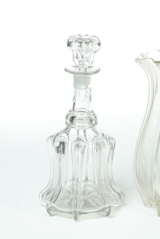 Pittsburgh, 2nd quarter-19th century, clear glass. Two celeries, 8 1/2"h. and 10 1/2"h. And one vase, 10 1/4"h. Together with a decanter. 12"h.