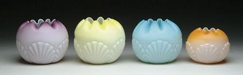 FOUR SATIN ROSE BOWLS. Lot consists of four rose bowls in the shell and seaweed pattern in colors of amethyst, blue, yellow and apricot. One is pictured in the "Collectible Glass Rose Bowls" by Johanna Billings fig. 36 pg. 25. Accompanying lot is an autographed copy of "Collectible Glass Rose Bowls" by Johanna Billings with Sean Billings. SIZE: Range from 4-1/2 in. to 5-1/2 in. dia. CONDITION: Very good to excellent. Collection of Johanna and Sean Billings 5-60889, 5-60939, 5-60974, 5-60975