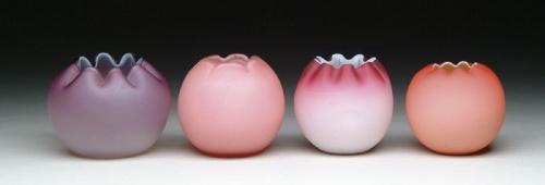 FOUR SATIN ROSE BOWLS. Lot consists of a Webb Peach Blow satin glass rose bowl with a white lining, an uncased amethyst satin glass rose bowl, an uncased pink satin glass rose bowl and a pink shading to white cased satin glass rose bowl. Three are pictured in the "Collectible Glass Rose Bowls" by Johanna Billings fig. 498 pg. 154, fig. 8 pg. 16 and fig. 164 and 165 pg. 57. SIZE: Range from 3 in. to 4 in. dia. CONDITION: Very good to excellent. Collection of Johanna and Sean Billings 5-60907, 5-60913, 5-60943, 5-60962