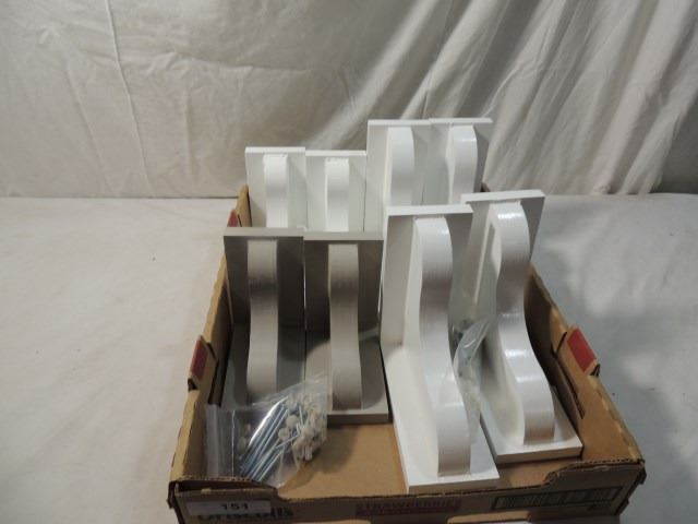 WINDOW, OR SHELF ARCHITECTURAL WOOD SUPPORTS OR BRACKETS. 6" AND 8" FOUR SETS. COMPLETE WITH SCREWS AND SCREW HEAD COVERS. AS SHOWN.