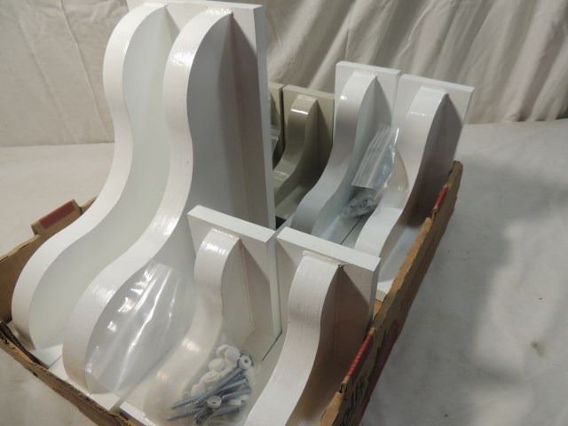 WINDOW, OR SHELF ARCHITECTURAL WOOD SUPPORTS OR BRACKETS. 6" - 8" AND 12" FOUR SETS. COMPLETE WITH SCREWS AND SCREW HEAD COVERS. AS SHOWN.