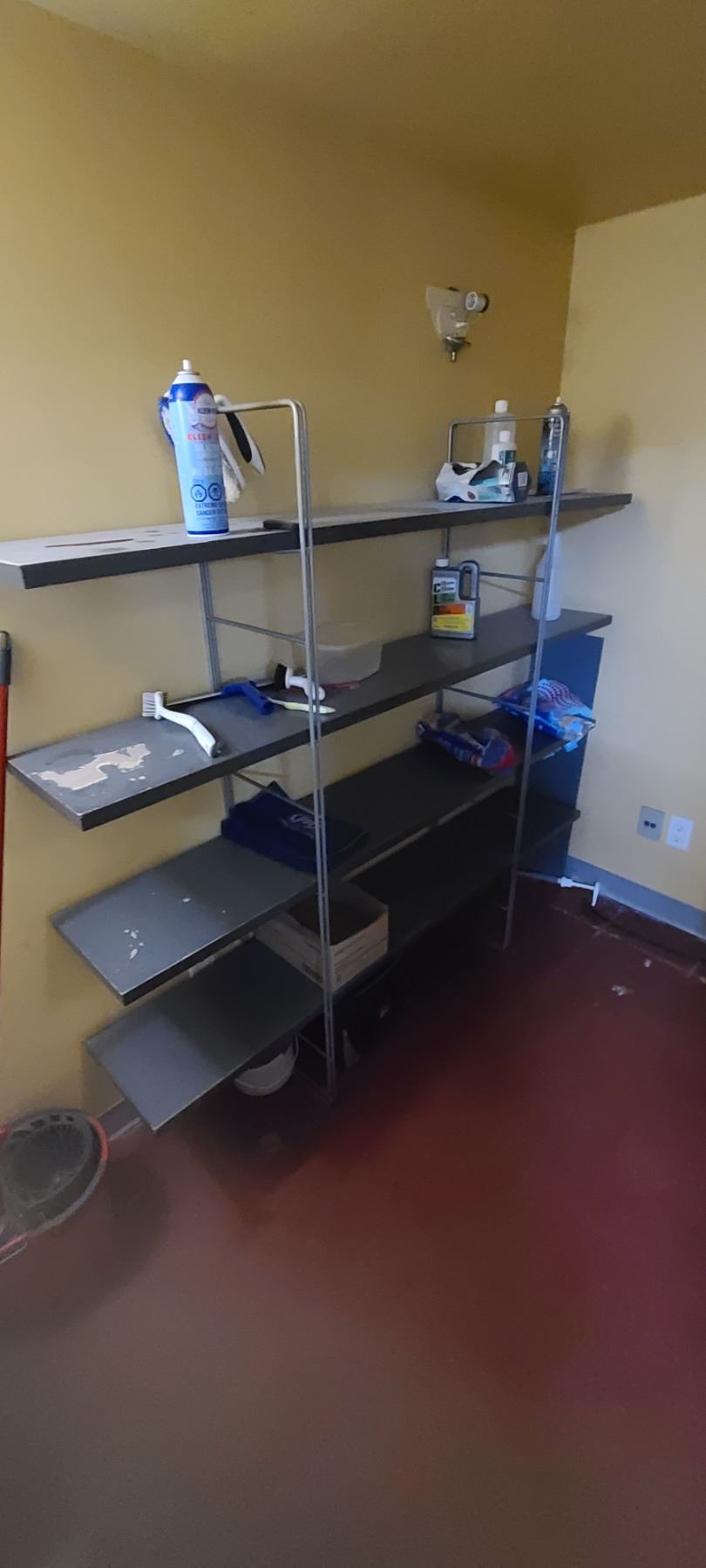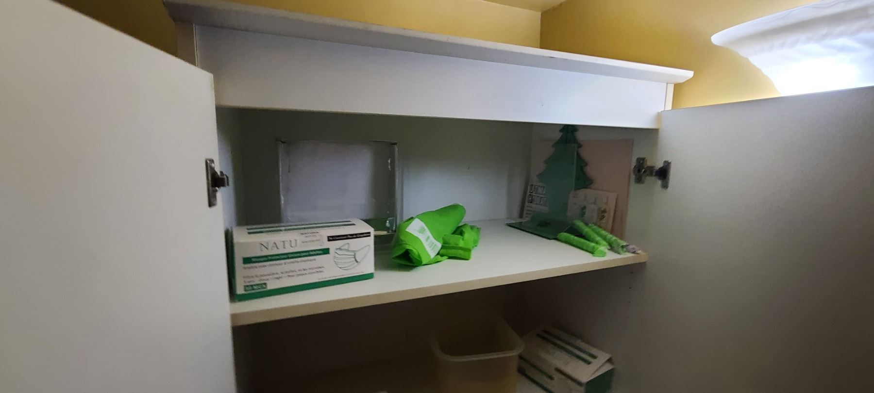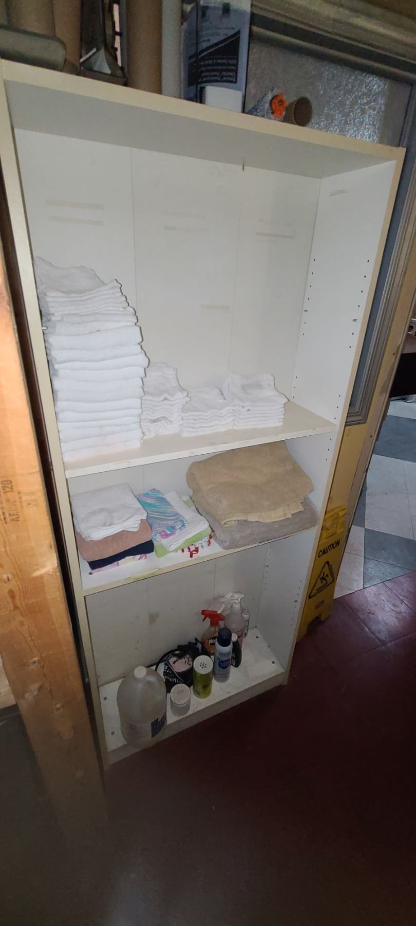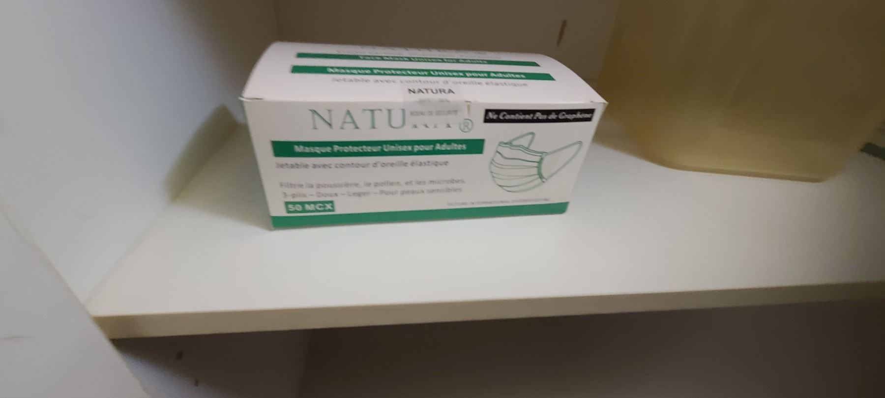 FOUR SHELVING UNITS AND MISC. MOP, SOCIAL DISTANCE SIGN, WET FLOOR SIGN AND LARGE LOT OF FACE MASKS