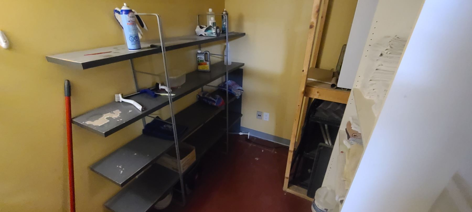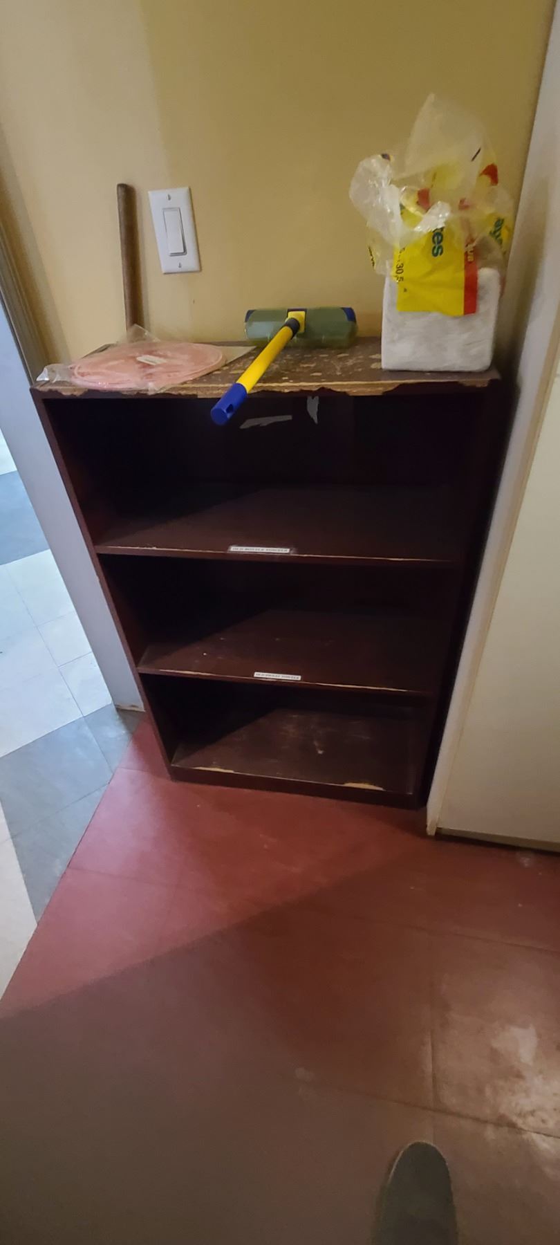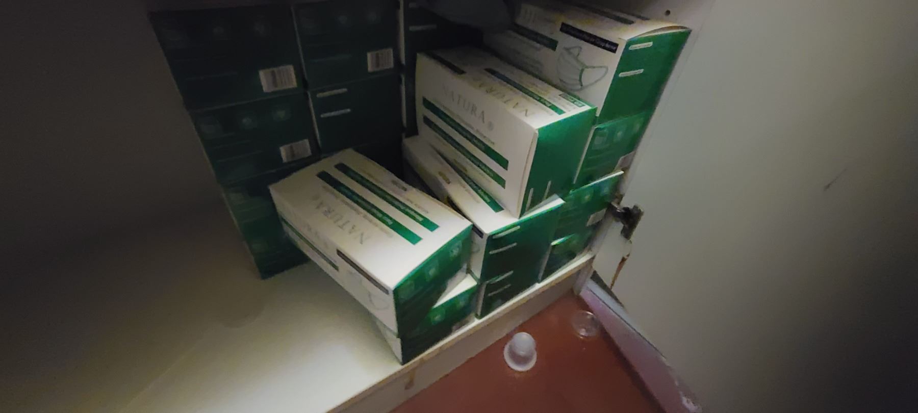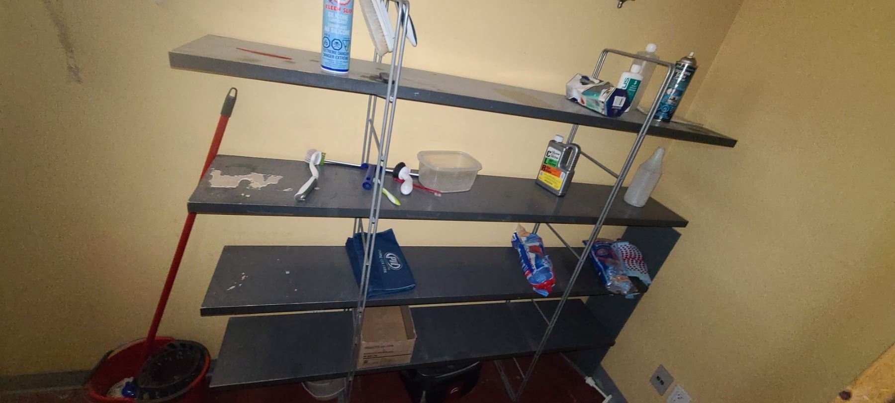FOUR SHELVING UNITS AND MISC. MOP, SOCIAL DISTANCE SIGN, WET FLOOR SIGN AND LARGE LOT OF FACE MASKS