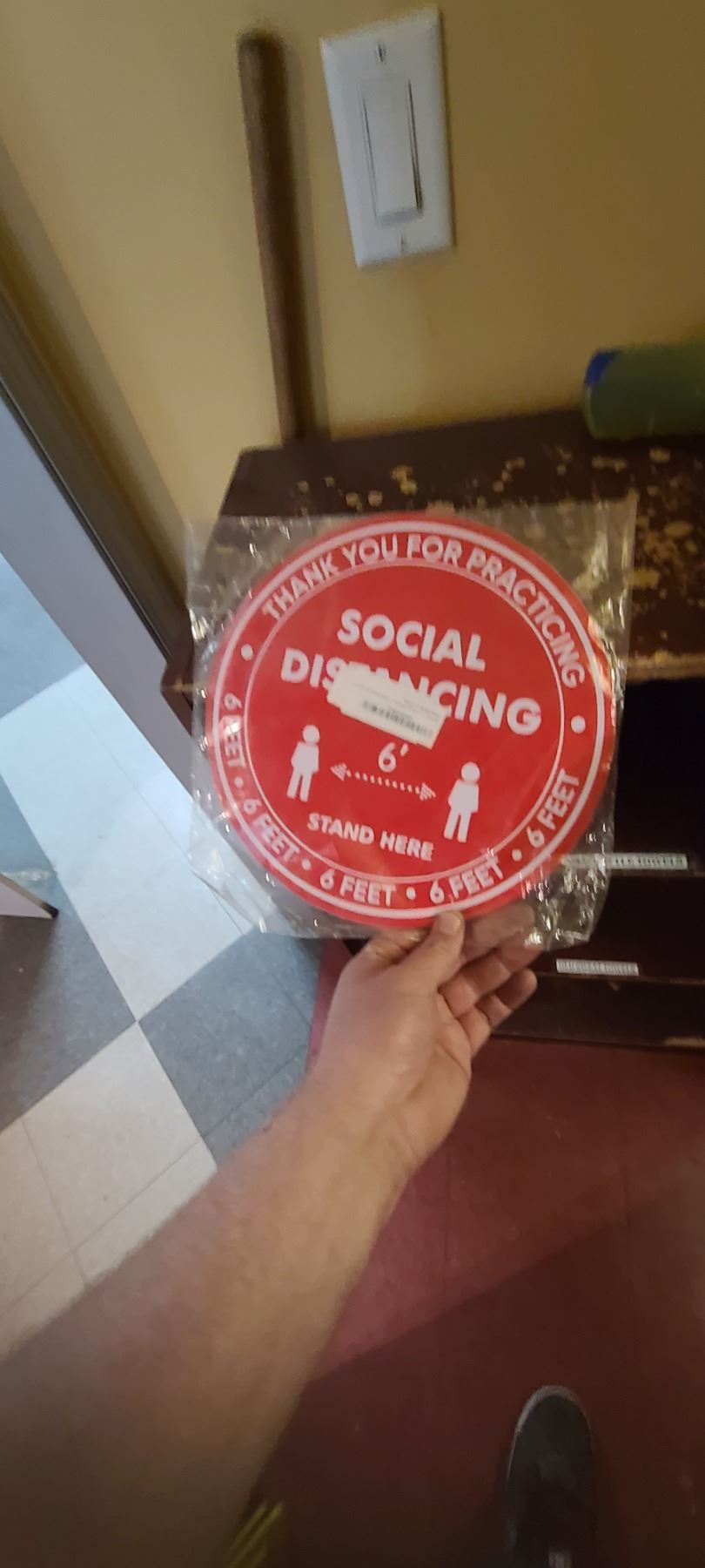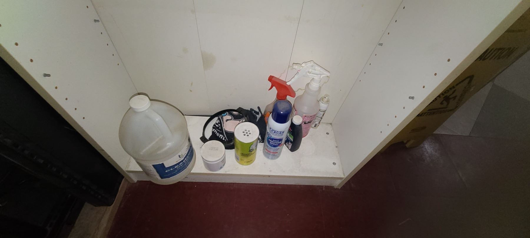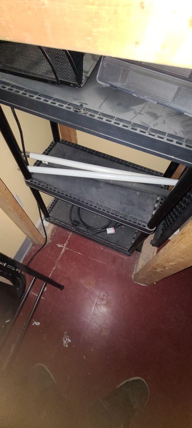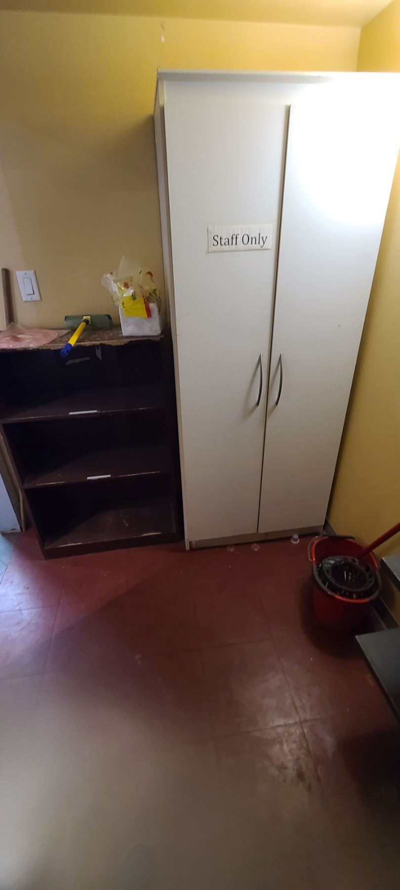 FOUR SHELVING UNITS AND MISC. MOP, SOCIAL DISTANCE SIGN, WET FLOOR SIGN AND LARGE LOT OF FACE MASKS
