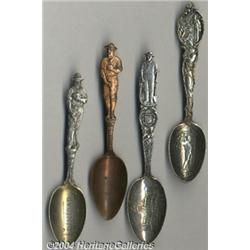 <B>FOUR SILVER AND COPPER MINING SOUVENIR SPOONS</B></I><BR>Various makers, c.1900<BR><BR>Group of four assorted mining theme spoons, one copper, <I>three marked sterling reverse of handles</B></I><BR>the longest, 5.75in. 4 Items <BR><BR><B>Important notice:</B> Heritage usually auctions material at the rate of 200-250 lots per hour. On some occasions eBay Live bid software or the Internet may not be able to keep up with the pace of the auction. We recommend placing a realistic absentee bid now as insurance to avoid disappointment. Occasionally the auctioneer may eliminate or reject an eBay Live bid, and the auctioneer may also reopen a lot after the close of the eBay live bidding (usually because we missed an audience bid), and may reject your bid even if it shows you as the winning bidder. By bidding via eBay Live, you agree that Heritage may award the lot to another bidder at its sole discretion under the circumstances described above or any other reasonable circumstances. Since eBay bids are not shown to us until we open the lot on the floor, we treat those bids just like floor bids. In most cases the floor responds before the eBay bid is presented to us, due to Internet lag time, so for consistency we have made it a policy that floor bids are always considered first over tie eBay live bids. Also please note that all Heritage lots purchased through eBay Live carry a 25% Buyer's Premium. Please make sure you read the Terms and Conditions before you bid. <BR><BR><B>IMPORTANT ANNOUNCEMENT ABOUT RESERVES:</B> Heritage now divulges all reserves on its web site 7 days before every auction. If you want to know whether the reserve on this lot has been met, and if not, what the reserve amount is, please visit this lot page on the HeritageCoin.com web site, or email: bid@HeritageGalleries.com </span></font>