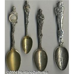 <B>FOUR SILVER MINING SOUVENIR SPOONS</B></I><BR>Various makers, c.1900<BR><Group of four assorted figural mining theme spoons, <I>marked sterling reverse of handles</B></I><BR>the longest, 5.75in. 4 Items <BR><BR><B>Important notice:</B> Heritage usually auctions material at the rate of 200-250 lots per hour. On some occasions eBay Live bid software or the Internet may not be able to keep up with the pace of the auction. We recommend placing a realistic absentee bid now as insurance to avoid disappointment. Occasionally the auctioneer may eliminate or reject an eBay Live bid, and the auctioneer may also reopen a lot after the close of the eBay live bidding (usually because we missed an audience bid), and may reject your bid even if it shows you as the winning bidder. By bidding via eBay Live, you agree that Heritage may award the lot to another bidder at its sole discretion under the circumstances described above or any other reasonable circumstances. Since eBay bids are not shown to us until we open the lot on the floor, we treat those bids just like floor bids. In most cases the floor responds before the eBay bid is presented to us, due to Internet lag time, so for consistency we have made it a policy that floor bids are always considered first over tie eBay live bids. Also please note that all Heritage lots purchased through eBay Live carry a 25% Buyer's Premium. Please make sure you read the Terms and Conditions before you bid. <BR><BR><B>IMPORTANT ANNOUNCEMENT ABOUT RESERVES:</B> Heritage now divulges all reserves on its web site 7 days before every auction. If you want to know whether the reserve on this lot has been met, and if not, what the reserve amount is, please visit this lot page on the HeritageCoin.com web site, or email: bid@HeritageGalleries.com </span></font>