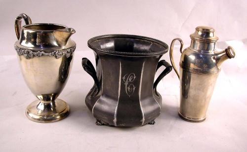FOUR SILVER PLATED COCKTAIL SHAKERS; Together with a water pitcher, planter, and handled carafe, largest 15"h