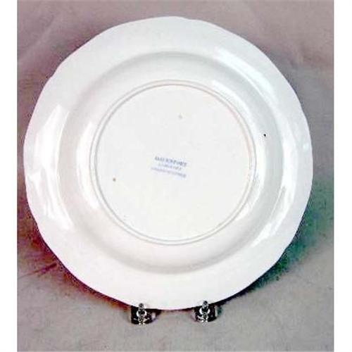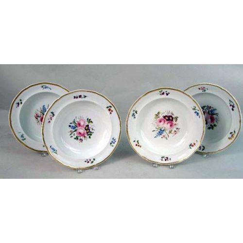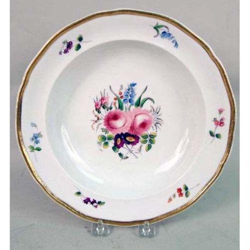 FOUR STAFFORDSHIRE POLYCHROME AND PARCEL-GILT DECORATED PORCELAIN RIM SOUP BOWLS<BR><BR>Stamped Davenport, Longport, losses, 10"dia.