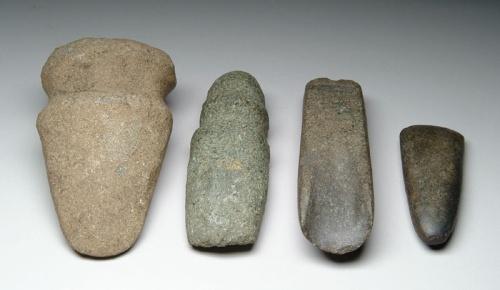 FOUR STONE AXES. 1) Full grooved axe of diabase. Middle to late Archaic, Circa 3000-4000BC style . 6-1/2in. x 4in.. Very good condition. 2) Grooved adze, granite rock. Found in Ludlow, Mass. Late Archaic, Circa 2000-3000BC style. 6in. x 2-1/2in.. Very good condition. 3) Channeled gouge, granite. Archaic, Circa 4000-5000BC style. Northeastern United States. 6-1/2in. l x 2in. w. Very good condition with some wear on the pole. 4) Celt, granite. Early Woodland, Circa 1000BC style-500AD style. 4-1/4in. l x 2in. w. Very good condition. CONDITION: As noted above. 9-25984-27 The Tennessee Collection of Prehistoric Indian Artifacts from the Allen Graves Estate. SPECIAL NOTE: We do not regularly sell Prehistoric Indian stone artifacts and therefore have very little experience and no expertise in this area. All of the following lots have come from the Collection of the Late Allen Graves of Tennessee. The collection was inherited some years back by his daughter, who now lives in Maine. This collection was consigned to us directly from her. We employed someone to generally identify styles and types, but as stated above, due to our lack of expertise in this field, we can not guarantee the age or origin of the following pieces. We are relying on you, the buyer, to determine to your satisfaction the origin and age of each item in the collection.