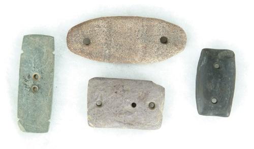 FOUR STONE GORGETS. Various stones of various time periods. CONDITION: Good to very good. 9-25984-150 The Tennessee Collection of Prehistoric Indian Artifacts from the Allen Graves Estate. SPECIAL NOTE: We do not regularly sell Prehistoric Indian stone artifacts and therefore have very little experience and no expertise in this area. All of the following lots have come from the Collection of the Late Allen Graves of Tennessee. The collection was inherited some years back by his daughter, who now lives in Maine. This collection was consigned to us directly from her. We employed someone to generally identify styles and types, but as stated above, due to our lack of expertise in this field, we can not guarantee the age or origin of the following pieces. We are relying on you, the buyer, to determine to your satisfaction the origin and age of each item in the collection.