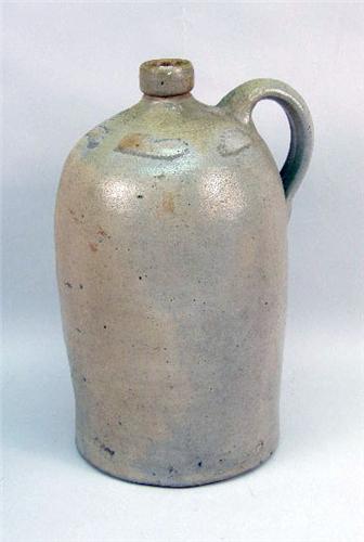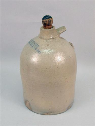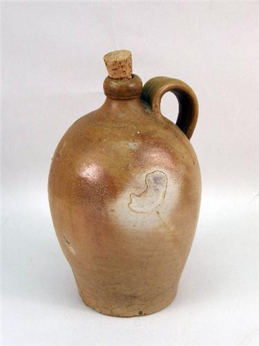 One incised "2". Together with a stamped "W.M. Adams Microbe Killer Co." jug, a whiskey bottle and a white-glazed jug, now electrified. 7 pieces. The "Microbe Killer" jug with broken handle.