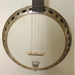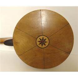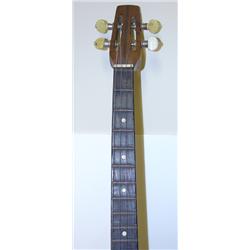 FOUR STRING BANJO with marquetry inlaid decoration on reverse & bent neck. 30.5" L