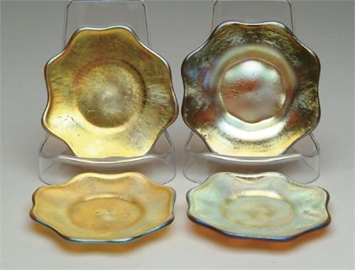 FOUR TIFFANY BUTTER PATS. Very nice Tiffany butter pats have bright gold iridescence with flashes of blue along the scalloped edge. Signed on the underside "LCT" and "LCT Favrile". SIZE: 3 in. dia. CONDITION: Some minor scratches to iridescence, otherwise very good to excellent. 5-61530