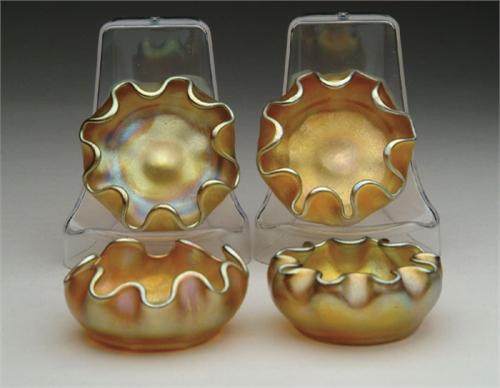FOUR TIFFANY SALTS. Four Tiffany salts have nice gold iridescent finish and highly ruffled rims. Each is signed on the underside "LCT". SIZE: Approx. 2-1/2 in. dia. CONDITION: Very good to excellent. 5-61222-1240