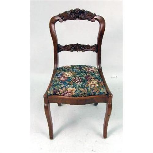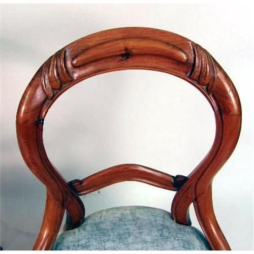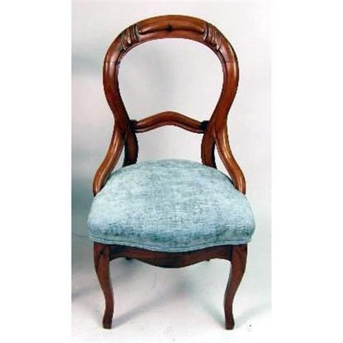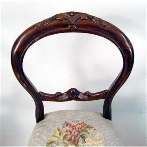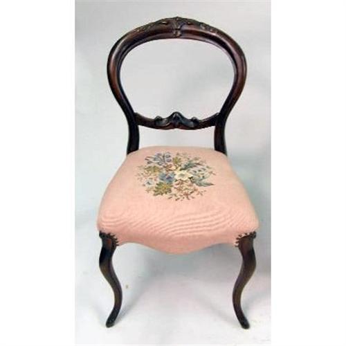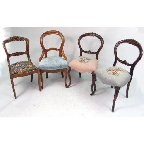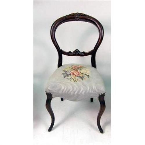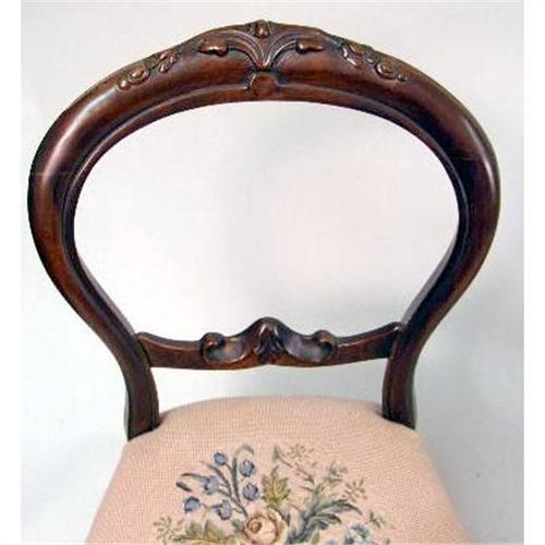 FOUR VICTORIAN WALNUT AND MAHOGANY SIDE CHAIRS<BR><BR>Comprising: a pair of open balloon backs with needlepoint seats, another with velvet seat and a carved ladder back with a slip seat