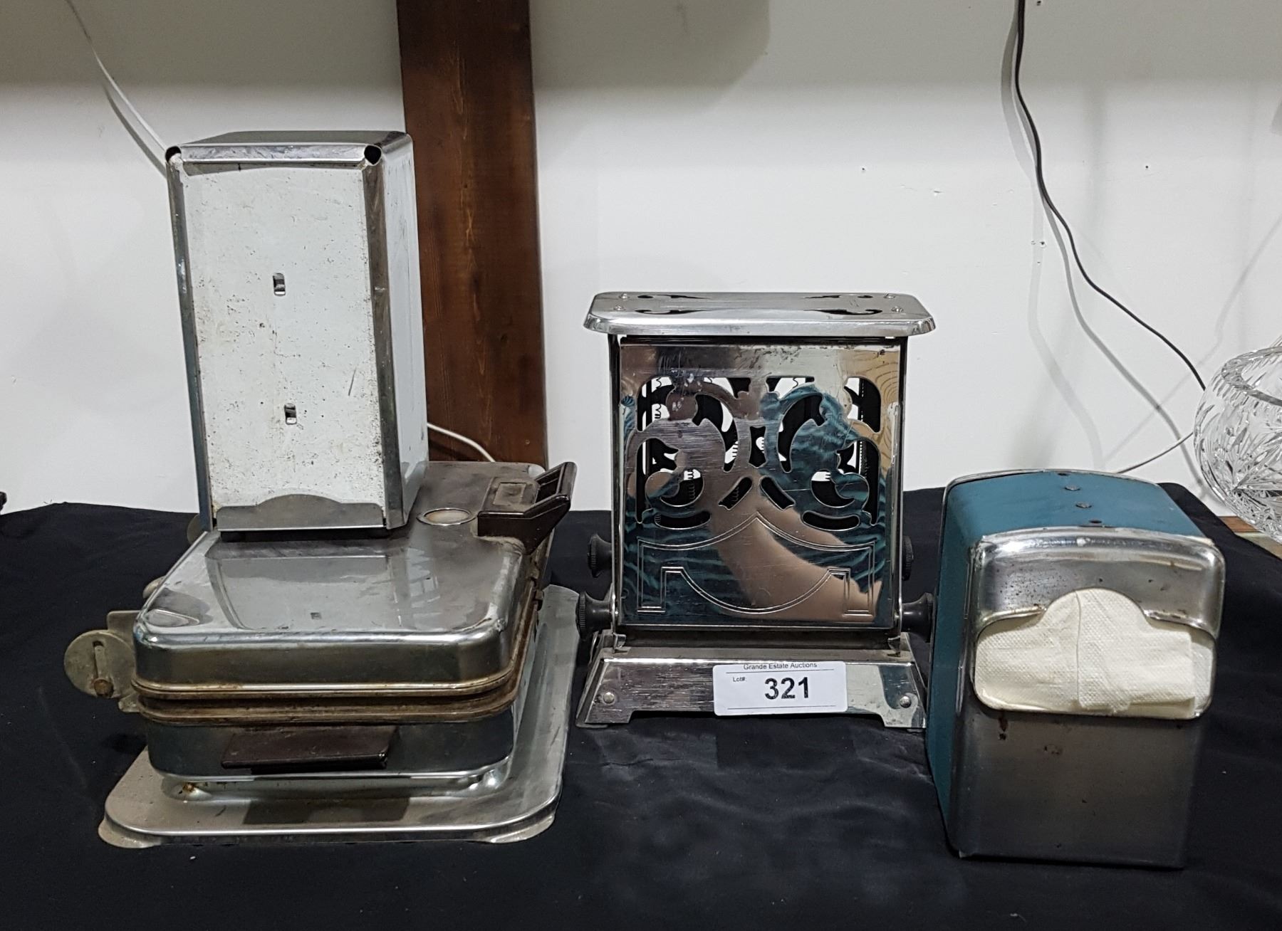 ANTIQUE TOASTER, 2 NAPKIN DISPENSERS, GRIDDLE